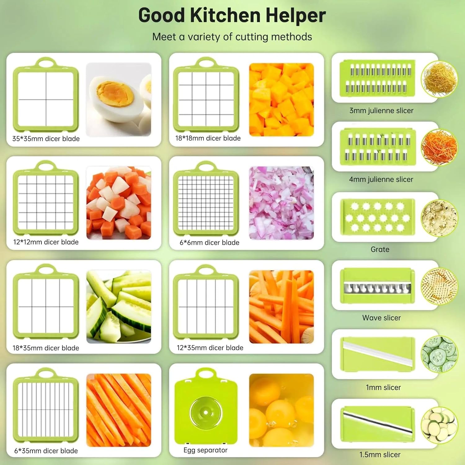 - عدة متكاملة 22 قطعة: تحتوي على 11 شفرة مختلفة بأشكال متنوعة لتقطيع وتقشير وبشر وتزيين الخضار والفاكهة بسهولة.