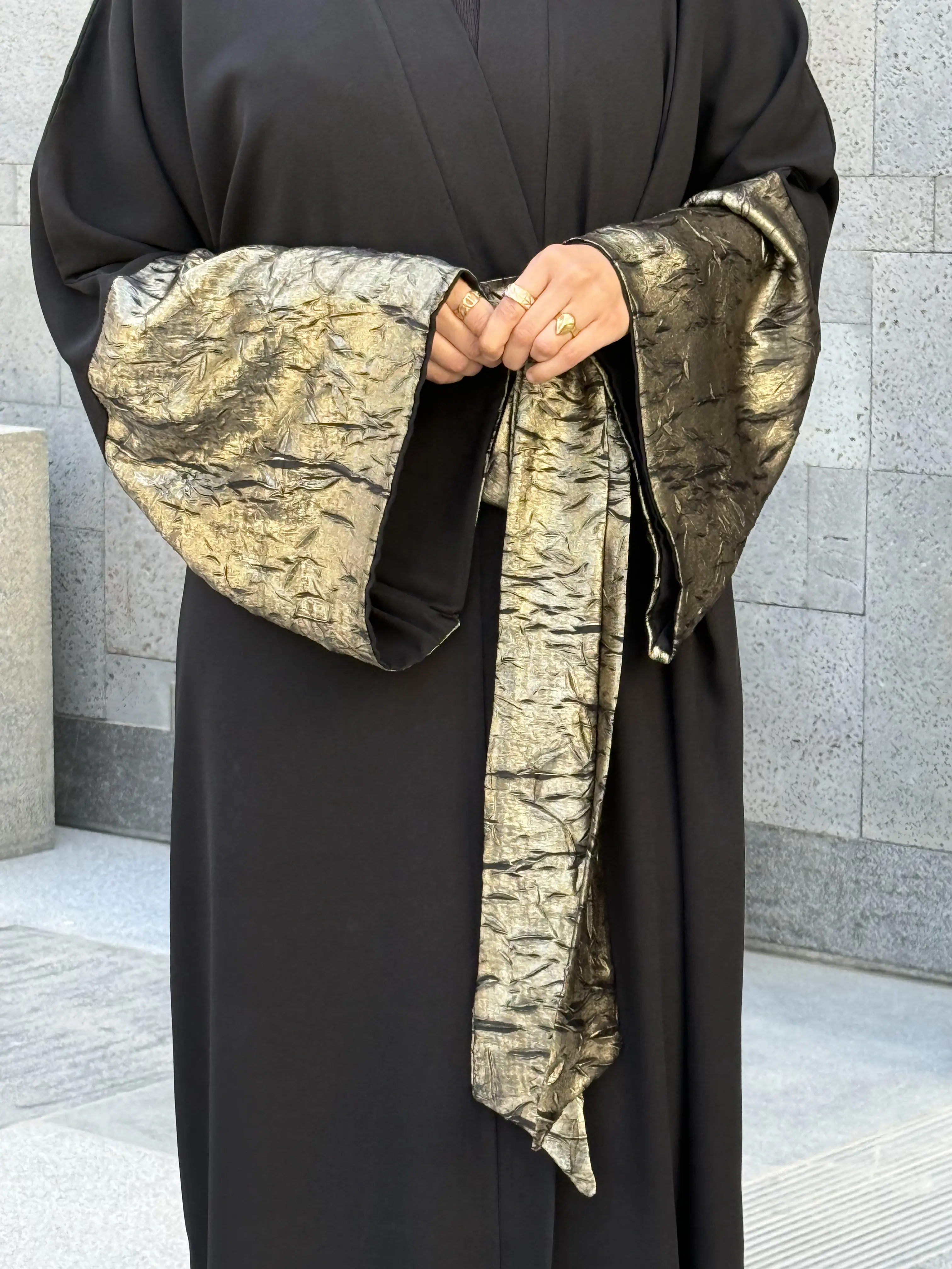 تعتبر هذه العباية من أرقى القطع في قسم الملابس النسائية لدينا، حيث يلتقي السواد الفاحم مع اللمعة المعدنية الذهبية المعتقة لتقديم لوحة فنية لا تُنسى.
